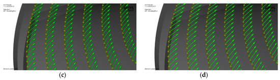 After importing the forces from CFX into the mechanical module, the structure was solved, and two main results were obtained: blade deflection and von Mises stresses on the turbine wheel. Figure 17 shows the stress contours of the turbine wheel at 40,219 rpm for two cases with different fiber orientation. The maximum stress value was found to be located at the connection between the blade root section and the wheel hub. Thereby, the stress concentration level at the joint can be avoided by increasing the fillet radius. Table 4 shows the maximum stress values for all cases with different fiber orientation.