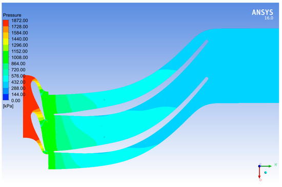 Figure 14 shows 3D streamlines of the velocity around the rotor and stator blades in case of R600a as a working fluid. We observed that the maximum velocity of R600a occurred at the nozzle outlet due to the acceleration effect of the nozzle throat. In addition, the flow velocity was relatively high at the rotor outlet due to the rotation of the rotor. When the energy of the fluid was extracted by rotating of the rotor blades, then the flow left the rotor outlet with less pressure as shown in Figure 15.