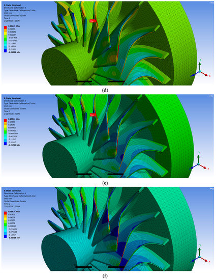 Directional deformation (z direction) for (a) steel rotor blades and (b–f) composite rotor with different fiber orientations: (b) 20°; (c) 30°; (d) 40°; (e) 50°; and (f) 60°.