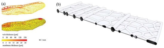 In general, rigid and foldable insect wings are a very popular object of investigation since they represent specialized flight organs heavily adapted to the locomotion of individual insects [6,7]. Around the world, researchers are studying insect wings in order to seek inspiration for the design of structurally efficient or deployable systems, as seen in the example of the development of micro air vehicles (MAVs) [8,9]. When the Studio One students looked into this topic, they were particularly intrigued by the work of Wang et al., who investigated the mechanical behavior of dragonfly wings [10]. The common dragonfly (Anisoptera) has thin and rigid wings characterized by a very distinctive vein network, as shown in Figure 5. The pattern’s geometry and structure give the wings a special resilience against bending and torsional deflections. Understanding the logic behind the architecture of these vein networks may spark the development of new composite materials and constructions with a high strength-to-weight ratio.