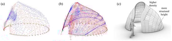 The students began their own investigations by studying the fiber arrangement and material distribution in dried cactus skeletons. They summarized their observations in a series of design principles, which reflect the plant’s capability to adapt its inner structure in a variety of ways. The first observation relates to the long lateral fibers that seem to have grown in the skeleton without visible discontinuities. This results in an anisotropic structure with a clear directionality and a better force transmission along the lateral axis. The second finding relates to smaller scale undulations and cross-connections of those fibers. The fibers effectively brace the structure and create an interlaced network that is much stiffer than the fibers would be individually. The third observation relates to the distribution of thicker lignified material in the skeleton. By comparing different locations of the skeleton, it was realized that the cactus accumulates more solid material in regions where the anticipated loads are higher than in other parts of the structure. In fact, the skeleton gets visibly thicker and heavier, while also featuring smaller hole sizes closer to the base of the structure. Inspired by these lightweight principles, the students explored multiple paths for their design explorations. On the one hand, they worked extensively with physical models made from thin strips of plywood veneer, as shown in Figure 21. The aim here was to explore the design space created by bending and coupling multiple strips to each other. On the other hand, the team investigated digital means of generating lattice-like structures similar to the cactus skeletons. In this context, it was very helpful to consult previous research by Lienhard et al. and Nabaei et al., who both discussed the form-finding of interlaced strip systems [31,32]. In the end, the team settled on two main strategies to digitally create their designs. The first approach was based on the Rhinoceros plugin Kangaroo Physics, which allows for real-time simulations of particle-spring systems. This interactive tool was very helpful to quickly produce multiple design iterations in the early stages of the creative process. As can be seen in Figure 22, some of these studies began with a densely-packed bundle of interconnected strips that were exposed to different growth rates, which resulted in delamination and a global bending of the entire structure. While this modeling technique created very pleasing visual results and came close to the actual growth processes in the cactus, it was very difficult to steer the development of form. The second technique, therefore, is an attempt to gain more control over the process by implementing Finite Element Methods (FEM) in SOFiSTiK. While this engineering software is typically used for post-design analysis, the students treated it as a design tool to simulate the bending and coupling of multiple strips while observing the increasing stresses in the deflected members, as illustrated in Figure 23. To pull different strips towards each other, the team used the method of contracting cables as described in more detail by Lienhard et al. [32]. This method gradually shortens cable elements between multiple meshes to produce a controlled deformation of the structure without requiring the information of an explicit nodal displacement path. The resulting form-finding process was additionally monitored by a self-developed plugin that checked whether the occurring bending and twisting deformations comply with predefined material limitations and safety factors that were derived from physical experiments.