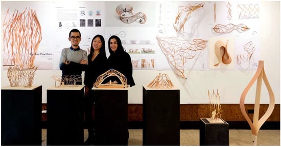 Once again, the students were faced with the challenge of finding inspirational role models for the design. Since the construction material of the pavilion, in this case strips of pultruded CFRP, was already known from the start, the team focused its efforts on finding scientific publications and biological samples that demonstrate natural lightweight structures made from fibers. The choice finally fell on wooden skeletons in cacti, specifically the fibrous anatomy in Cylindropuntia acanthocarpa (commonly known as Buckhorn Cholla) and Opuntia basilaris (known as Prickly Pear), as shown in Figure 20. Unlike smaller, round or barrel-shaped cacti that only consist of water-storing tissue, these cacti can grow much taller and effectively combine water storage with structural support by means of an inner lignified scaffold. In fact, inside the cylindrical stems of the Cholla or the flattened pads of the Prickly Pear, one can find reticulate vascular bundles that form lightweight yet astonishingly strong lattice structures [27,28]. In recent years, these skeletons have fascinated botanists and biomechanics alike. Their research investigates how the cacti’s shape and composition may be the result of specific growth processes and load adaptations that take place on different hierarchical levels [29,30].