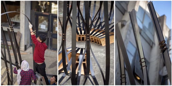 - Lienhard, J.; La Magna, R.; Knippers, J. Form-finding bending-active structures with temporary ultra-elastic contraction elements. WIT Trans. Built Envir. 2014, 136, 107. [Google Scholar]