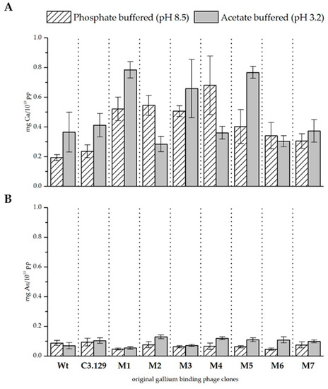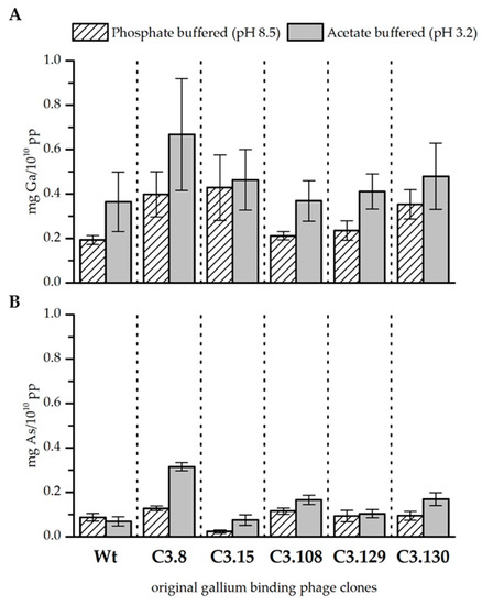 In order to determine the sorptive behavior of those five phage clones, six different model solutions at pH 3.2 or 8.5 were used. Each solution contained approximately 3 mM gallium or arsenic or 3 mM gallium and arsenic in combined solutions (see Table 3). A defined amount of phage particles was incubated in the model solutions. Phage particles were coprecipitated with bound metal, thus determining the interaction of bacteriophage clones with metal ions in solution. In addition to the gallium-binding bacteriophage clones, a clone corresponding to the wild-type (Wt), i.e., which did not present a peptide sequence, was also carried as a control experiment. This reference shows the influence of the peptide sequences of the clones.