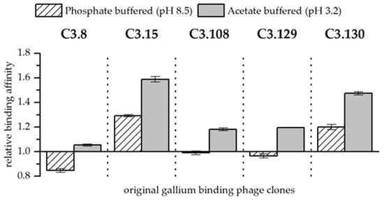 When both elements are present in the solutions, they compete for sorption to the bacteriophage. Biosorption experiments with solutions at pH 3.2 and 8.5 and approximately equimolar concentrations of arsenic and gallium showed differences in their affinity for the respective elements. These results are of particular interest because gallium-binding peptides should be able to distinguish between gallium and arsenic for later application. In order to better assess the effect of the peptides presented on the bacteriophage, the wild-type phage was again used as a reference. Figure 2 shows the affinity of gallium-binding clones for gallium in comparison to arsenic and in relation to the biosorption to the wild-type control. In general, it was found that at pH 3.2, the peptides have a higher affinity for gallium compared to arsenic than at pH 8.5. Furthermore, at pH 3.2, all displayed peptides show a preference for interacting with gallium compared to arsenic. As already discussed, the Ga3+ ion occurring at low pH has a considerable advantage for the formation of a complex compared to arsenate. It is therefore assumed that the greater affinity is the result of chelating effects. At pH 8.5, only the phage clones expressing the peptides C3.15 (NYLPHQSSSPSR) and C3.130 (NDLQRHRLTAGP) showed a considerable better biosorption of gallium compared to arsenic (see Figure 2). In the case of the other peptides, even a slightly increased affinity for arsenic could be observed. Therefore, it is unlikely that these peptides are selectively binding gallium. It is assumed that the compact molecular structure makes direct binding of gallium difficult. However, substitutions of hydroxide ligands by peptides that bind gallium with a very high affinity is possible due to ligand substitution effects.