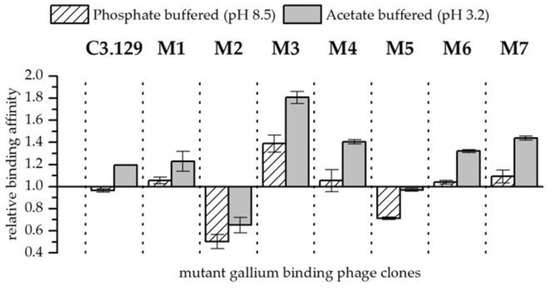 In experiments in which gallium and arsenic were present together in the solution, the affinity of bacteriophage for gallium compared to arsenic could be increased by the cysteine scanning (see Figure 4). Exceptions are the mutants M2 and M5. The respective changes in the amino acids increased the affinity of the mutants for arsenic compared to gallium. A highly increased affinity for gallium with arsenic at both pH points could be observed in the biosorption behavior of mutant M3. It can be speculated that by closing the disulphide bridge between the amino acids at positions 3 and 8, a pocket is created which is able to complex Ga3+ with high stability. However, more sophisticated structural analyses of synthetic peptides would be necessary to verify such an assumption. In addition to the strongly enhanced biosorption of gallium compared to arsenic from mutant M3, an improvement in gallium affinity at pH 3.2 for mutants M4 and M7 could also be observed. Interestingly, the mutants M3 and M4 each substituted aspartic acid once, and mutant M7 concealed both aspartic acid groups probably by the formation of a peptide ring that is displayed on the bacteriophage. Possibly, the acidic side chain functionality impeded the specific recognition of Ga3+.