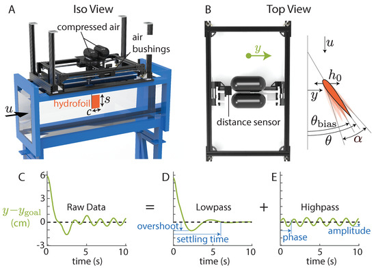 A pitch-biased hydrofoil suspended from air bushings performed lateral maneuvers in a water channel. (A) Channel: Rolling Hills 1520; test section: 1.52 m long, 0.38 m wide, and 0.45 m deep. Compressed air at 4500 psi. (B) Carriage is free to move laterally (). The hydrofoil is driven with pitch oscillations (), leading to passive surging (amplitude ). (C–E) The hydrofoil’s response during a 6 cm lateral maneuver was decoupled into its low () and high () frequency components using a moving average filter.