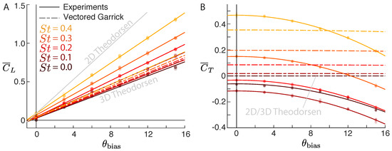 The tethered hydrofoil tests showed that the lift coefficient of a flapping hydrofoil increases linearly with pitch bias, with a slope that increases with Strouhal number (Figure 2A). To facilitate direct comparison with the theoretical models presented in Section 4, the Vectored Garrick model (dashed lines; Section 4.3) and the 3D Theodorsen model (Section 4.1) are also overlaid in Figure 2. Both models predict the slope well when the airfoil is not flapping ( = 0), but underestimates the slope for all other Strouhal numbers. One would expect the two models and our data to agree when = 0, because there the Garrick and Theodorsen models are the same as the well-established thin airfoil theory. However, with a flapping airfoil, the Theodorsen model wrongly predicts no increase in lift, and the Garrick model underpredicts the increase in lift.