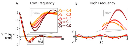 The response in lateral position (y) depends on Strouhal number. (A) The lowpass-filtered lateral position settles into a new equilibrium after around 5 s. The overshoots and settling times (see Figure 1D) are larger for lower Strouhal numbers. Inset: average, dark lines; average (), shaded bands. (B) The high-pass filtered lateral position oscillates at the pitching frequency. The phases and amplitudes of oscillation (see Figure 1E) decrease with higher Strouhal numbers.