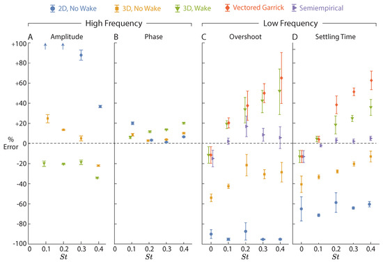 Predictive power varies between models and changes with Strouhal number within each model. Positive % Error implies a metric was overpredicted by the model; negative % Error implies an underprediction. Markers are sometimes shifted left/right to render them distinguishable; all data were taken at exactly = 0, 0.1, 0.2, 0.3, or 0.4. Errors were calculated based on the high frequency content of the lateral position response (amplitude, A; phase, B) and the low frequency content of the lateral position response (overshoot, C; settling time, D). High frequency predictions for the Vectored Garrick and Semiempirical models are the same as the 3D Wake model.