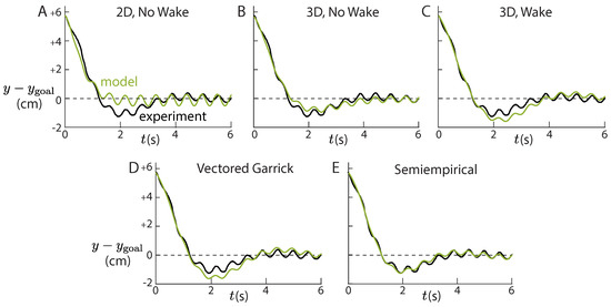 Only the semiempirical model brings low frequency errors down below 20% (Figure 4C,D). Unlike the flat wake model, the semiempirical model does not overemphasize the wake’s effects, so the lateral position dynamics are more properly damped. Of the models considered, the semiempirical one seems to offer the highest accuracy for predicting low frequency lateral motions. The remaining errors in the semiempirical model are likely due to our assumption that time-averaged forces on a fixed foil apply to a foil that heaves passively, whereas those forces are known to differ based on theory [14] and experiments [20]. The time-average forces could be measured with a heaving foil instead of a static foil to increase the accuracy of the semi-empirical model.