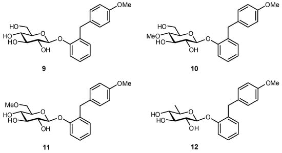 As mentioned previously, the sodium glucose co-transporter 2 (SGLT2) is a novel target for lowering glucose levels in diabetic patients since inhibitors have been shown to potentially lower the renal reabsorption of glucose and reduce the risk of hyperglycemia [,]. In a recent study, a library of Sergliflozin-A (9) derivatives were prepared with various substitutions on the glucose fragment (methyl etherification, deoxygenation, deoxyfluorination) (Figure 3) []. The 4-OMe derivative (10) displayed similar potency to Sergliflozin-A (73% of the inhibition) in a rat urinary glucose excretion experiment, and with significantly improved pharmacokinetic stability. The 6-deoxy analogue 12 was also shown to be a mild inhibitor, while derivatives with substitutions at C-2 and C-3 were inactive.
