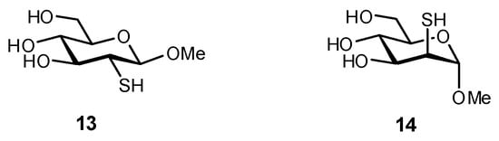 Several methods have been established to synthesize thiosugars to obtain glycomimetics such as 13 and 14 (Figure 4) []. As it was previously reported that S-linked pseudodisaccharides bound better to the plant lectin concanavalin A (ConA) than their respective O-derivatives [], isothermal titration calorimetry (ITC) and saturation transfer difference (STD) NMR experiments were used to evaluate the binding of these 2-thioglycosides to ConA. Surprisingly, the 2-deoxy-2-thio-mannoside derivative 14 was observed to bind ConA much better than Man itself [,], although STD NMR experiments suggested that this enhancement in affinity is actually the result of a slightly altered binding mode.