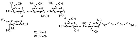 The Globo H epitope has been used in clinical trials of several carbohydrate-based conjugate vaccines targeting late stage breast cancer, ovarian cancer, and prostate cancer []. In order to improve efficacy, it was desired to create a glycomimetic which would be more immunogenic yet still elicit antibodies cross-reactive with the native antigen present on tumor cells. Globo H derivatives were prepared with modification at either C-6 of the reducing end Glc moiety (F, N3, OPh, O-p-nitrophenyl, NO2 derivatives) or on the C-6 methyl group of Fuc (OH, N3, F, alkyne derivatives) []. Upon synthesis, the glycomimetic analogues were conjugated to a diphtheria toxoid cross-reactive material (CRM) 197 carrier protein, and then together with the adjuvant glycolipid C34 were injected into Balb/c mice. IgG antibodies elicited from several of the Glc derivatives as well as the 6-N3-Fuc derivative (21; Figure 8) were shown to be cross-reactive with Globo H and its related epitopes Gb5 and SSEAS4, as measured in a glycan array. The antibodies also recognized cell surface structures on Globo H-expressing MCF-7 tumor cells and could affect complement-dependent cytotoxic responses.