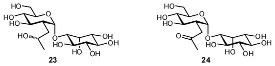 Mycothiol is a 1-d-1-O-[2-N-acetamido-l-cysteinamido)-2-deoxy-α-d-glucopyranosyl]-myo-inositol which appears to play an important role in actinomycetes in protection from toxic agents and in preventing on oxidative intracellular environment, similar to the role of glutathione []. The disaccharide 1-d-1-O-(2-acetamido-2-deoxy-α-d-glucopyranosyl)-myo-inositol is an intermediate in Mycobacteria mycothiol production, and inhibitors of an N-deacetylase enzyme could potentially be used as a treatment against infection. Derivatives in which the NHAc group of the GlcNAc moiety was replaced by a C-2 substituent were synthesized and evaluated as inhibitors (Figure 10) []. Both 2-deoxy-2-C-(2′-hydroxypropyl)-d-glucoside (23) and 2-deoxy-2-C-(2′-oxopropyl)-d-glucose (24) derivatives successfully inhibited the production of inositol-containing metabolites, as measured by the incorporation of radiolabeled [3H]inositol into molecules, but unexpectedly did not affect the growth of Mycobacterium smegmatis in vitro.