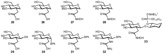 A number of NHAc biomimetics have also been directed at enhancing interactions with important metal ions present in the binding site, in efforts to introduce stronger chelating functionalities. Trypanosoma brucei N-acetylglucosamine-phosphatidylinositol (GlcNAc-PI) de-N-acetylase is a zinc metalloenzyme involved in the biosynthesis of glycosylphosphatidylinositol []. T. brucei is rich in GPI-anchored proteins and it is believed that disrupting their synthesis may offer a potential therapy for African sleeping sickness [,]. A computational homology model based on two other GlcNAc-PI de-N-acetylases supports a binding mode where the NHAc group is involved in coordination of a Zn2+ ion []. In efforts to install a better Zn2+-binding group at the C-2 position of GlcNAc, a series of analogues were prepared and evaluated for their ability to inhibit the de-N-acetylase (Figure 11) [,]. Both carboxylic acid (25, 29, 31) and hydroxamic acid (27, 33) derivatives demonstrated enzyme inhibition with moderate IC50 values (0.1–1.5 mM) []. A similar approach to enhanced metal chelation was used for developing inhibitors of the de-N-acetylase PgaB, which is known to coordinate to the 2-NHAc and 3-OH substituents of GlcNAc []. Both the groups at C-3 (–OH, –SH, –NH2, and –N3) and C-2 (–NHC(=S)CH3), –NHS(=O)(=O)CH3, –CH2P(=O)(–OH)OMe, and –CH2S(=O)(=O)NH2) were modified and screened as inhibitors of de-N-acetylases which play an important role in biofilm maintenance []. The strongest inhibitor, 2,3-dideoxy-2-thionoacetamide-3-thio-β-d-glucoside displayed a Ki of 2.9 ± 0.6 μM.