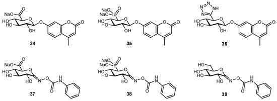 In one of the few studies reported, a series of phosphono and tetrazolyl derivatives of 4-methylumbelliferyl β-d-glucuronide were synthesized and evaluated as inhibitors of β-glucuronidases (Figure 12) []. The phosphonate analogue 35 was observed to be slowly hydrolyzed by an E. coli β-glucuronidase, but was not a substrate for bovine liver β-glucuronidase. In inhibitory experiments, strong binding was observed only for the native carboxylate analogue 37 (IC50: 0.2 μM) and only very weak inhibition for phosphonate 38 (IC50: 2 mM).