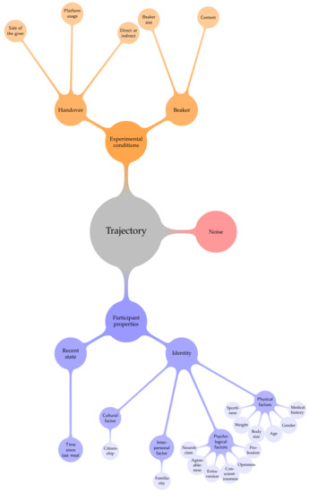 All of the mentioned factors are different properties of the participants. Under given experimental conditions, is it possible to determine the participant, who performed the motion or some of his or her properties by an automatic classification of the trajectory? As mentioned in the preceding subsection, the experimental conditions are further factors, which could be determined in the same way. Before the experiments, the properties of the participants were assessed. Then, we studied if there is a statistically significant correlation of factors like the experimental conditions, the participant identity or the participant properties and the hand trajectories, or if the correlation between these factors and the trajectories is overshadowed by random fluctuations. The studied factors and the possible connections between them are sketched in Figure 1.