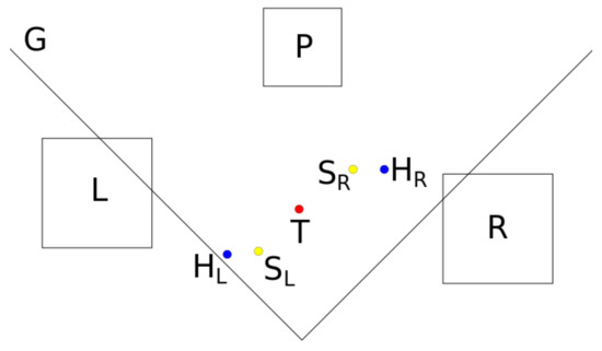 Schematic diagram of the experimental setup, seen from above. G is the glass plate, L the stool of the left participant, R the stool of the right participant, P the wooden rack, which can be used as platform, and the resting places for the right hand of the left or right participant, respectively, and the start and destination positions of the plastic can, which can change their roles together with the role of the participants, and T the place of the hand-over.