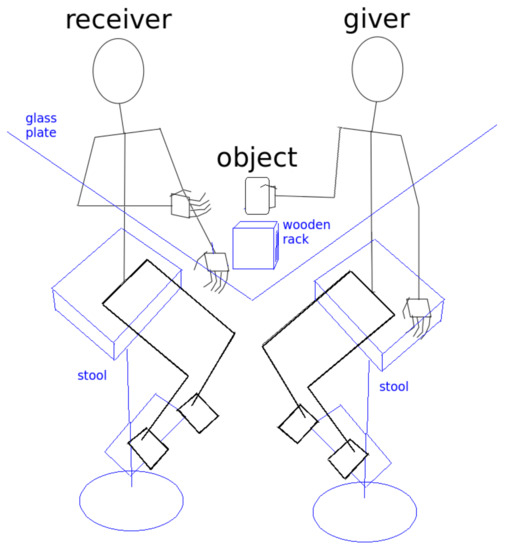 Before the experiment, the right hand of the left person rests at point in Figure 2 and the right hand of the right subject at point . Both points are marked visibly for the participants. The experiment starts with placing one of the plastic cans at a fixed starting place, also marked visibly, close to the hand of the person chosen to be the giver. If the left participant is the giver, is the starting place; if the right subject is the giver, is the starting place. The giver takes up the object and moves it to the hand-over point T. (This moment is shown in Figure 3). The receiver takes the object and puts it at a pre-defined destination location. If the left participant is the giver, is the destination location; if the right subject is the giver, is the destination location. In other words, and change their roles as starting point and destination location depending on the roles of the participants.