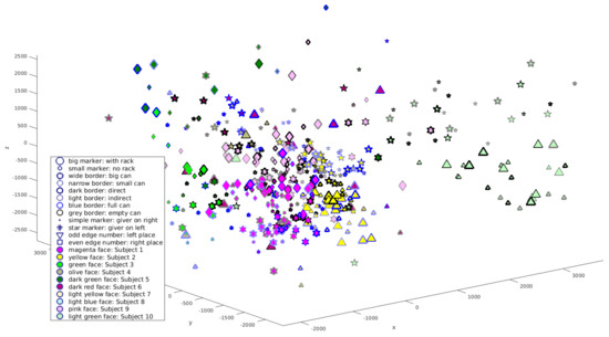 In Figure 5, markers with the same colour represent the same participant and star-shaped and convex markers represent the roles of each person as giver or receiver, respectively. As can be seen from the distribution of markers with different colours in the tigure, hand trajectories of different participants are concentrated in different regions of the space, separated from the trajectories of other people. In addition, for each participant, markers belonging to the role as giver or receiver, respectively, are concentrated in different regions and separated from each other.