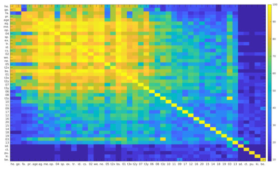 Mutual information between the experimental factors and the trajectory. The different factors including the trajectory are given on both axes, the mutual information of two factors is represented by the colour at the intersection of the row and column belonging to the two factors. The colour coding is given on the bar on the right side. The numbers on the bar represent percentiles of all mutual information values. The different factors are abbreviated in the following way: he.: problems with the right arm or shoulder, ge.: gender, fa.: familiarity with the other participant, pr.: profession, age: age of the participant, ag.: agreeableness, me.: time since last meal, op.: openness, sp.: hours for sports per week, ex.: extraversion, tr.: one-dimensional projection of the trajectory, id.: identity of the participant, cs.: conscientiousness, we.: weight, ne.: neuroticism, t2x: x-component of the two-dimensional projection of the trajectory, bs.: body size, t3x: x-component of the three-dimensional projection of the trajectory, t2y: y-component of the two-dimensional projection of the trajectory, t3y: y-component of the three-dimensional projection of the trajectory, t3z: z-component of the two-dimensional projection of the trajectory, sd.: side of the giver, ct.: content of the beaker (full or empty), pu.: platform usage, ki.: kind of handover (direct or indirect), be.: beaker size. The numbers at the abscissa and the ordinate are referring to the components of the 20-dimensional projection of the trajectory.