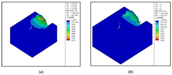 Due to the limitations of the Drucker–Prager elastic–perfectly plastic material model, the results are only compared at the lowest harrowing speeds of 4.4 km/h. Generally, the horizontal force results obtained from finite element methods were lower than those obtained from the indoor experiment (Table 3 and Figure 8). The coefficient of friction at the soil–plough interface could have been underestimated especially for bionic discs with UHMPE convex domes as it is generally very difficult to determine during the triaxial experiment. This is further supported by the plain disc which had the least difference of only 1.38% with more soil sticking on the disc surface compared to the bionic harrowing disc. It was difficult to correctly estimate the amount of soil which was going to stick on a bionic harrowing disc and factor it in the model. However, the difference between the model and the experiment was still less than 10%, in line with past FEM results [8,9,20]. Conforming to the general trend from past experiments, disc sample 9 gave the best performance with the highest draft force reduction of 15% compared to sample 1 which was just plain, and generally convex domes performed better than the plain ones and the concave dips [17,21]. The highest reduction of 15% is lower than that of the experiment which is at 19.5% reduction in horizontal force for sample 9 (Table 3 and Figure 8). Furthermore, convex units with bigger height of 3 mm were more effective in reducing the horizontal force most likely due to better ability to entrap more air between the non-smooth units and effectively reduce soil adhesion and friction. According to past researches, the biomimetic designed discs showed a significant reduction in drawbar power by up to 23% [15,16,17,21,22].