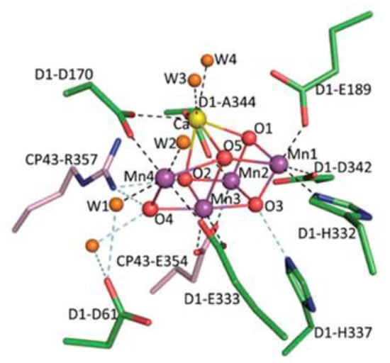 Green plants, algae, and some bacteria use water as a source of electrons in the process of photosynthesis to restore carbon dioxide into carbohydrates, resulting in the release of molecular oxygen. Water oxidation occurs in the coordination sphere of the manganese cofactor, which is associated with the polypeptide D1 of photosystem II (PSII), which according to the latest spectroscopic studies contains 4 Mn atoms and one calcium atom and has a cubane-like structure (Figure 1) [].
