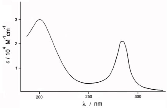 Freshly prepared aqueous solution of the investigated Complex 1, concentration 2 × 10−3 M, was painted yellow-brown. Its electronic spectrum, shown in Figure 2, contains two intensive absorption bands in the ultraviolet region with λ = 203 and 287 nm, and less intensive bands at λ = 335–380 and λ = 435 nm (not shown in Figure 2). Over time, the intensity of all the bands drops: In the first 30–60 min, a sharp drop ε in all the bands is observed, and then it slows down. A day later, only a small plateau at 410–440 nm remains in the visible area. At the same time, all the bands gradually shift (≈10 nm) towards shorter wavelengths and the solution becomes lighter. The observed gypsum shift of absorption bands in the visible region and their decreasing intensity may be a consequence of the replacement of Cl ions in the internal sphere of the complex by water molecules. This assumption is plausible, because due to the short Ru-N bond (1.715 Å) in the nitrido complex the translabilizing effect can lead to weakening of the Ru-Cl bond.