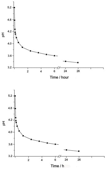 The pH value of the freshly prepared Complex 1 (2 × 10−3 M) is equal to 5.2 and quickly decreases during the first 40 min, as shown in Figure 3.