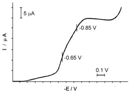 Polarogram of the aqueous solution of Complex 1, (Ru2) = 2 × 10−3 M, the background electrolyte is 0.1 M NaCl.