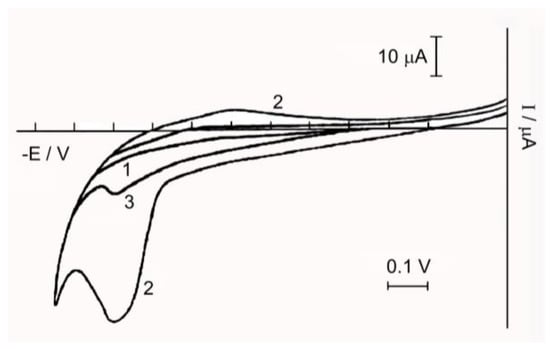 The electrochemical behavior of the solution of Complex 1 is very different from the behavior of its oxygen counterpart []. While the binuclear Oxo-complex 2 is reduced on the platinum electrode at E = 0.40 V [], the binuclear nitrido Complex 1 is reduced in the region of more negative potentials (Figure 4).