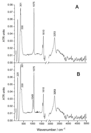 The possibility of decomposition of Complex 1 in acidic solutions is unlikely due to the short distance Ru-N. To confirm this assumption, we compared the IR spectra of the initially solid complex and the substance obtained by evaporation at room temperature in a rotary evaporator of its solution, aged for 2 days (Figure 6). The comparison of IR spectra showed that the band at 1075 cm−1, attributed to stretching vibrations of the Ru–N–Ru bonds, is present in the IR spectra of both substances, but the second band at 1049 cm−1 appears in the spectrum of the substance obtained after evaporation of the solution, which may be associated with the replacement chlorine atoms to water molecules, as indicated by some of the above methods. In the near spectral region, there are characteristic strong vibrations of the Cl–Ru–Cl bonds at 220 cm−1, as well as the Ru–Cl band at 301 cm−1 and the Ru–N shoulder at 330 cm−1. The stretching vibrations of the water and hydroxyl groups appear in the form of a broad band with a maximum at 3253 cm−1, and the deformation vibrations of adsorbed water in the form of a band at 1610 cm−1.