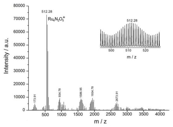 Figure 7 shows the mass spectrum of the product of the reduction of the initial Complex 1 with water, in which the maximum peak with a mass of m/z = 512.28 corresponds to the tetra-nuclear ruthenium cation Ru4N2O5+ and its isotopic distribution.