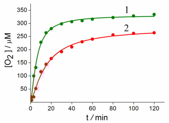 From Figure 8 it can be clearly seen that Complex 1 is more active (TOF 0.33 s−1, TON 304) compared with Complex 2 (TOF = 0.12 s−1, TON 240). The rather high activity 1 indicates the strength of the catalyst structure in comparison with other previously described systems containing organic ligands and the labile bonds Ru-O-Ru [,,,]. The effect of the Li+ cation is not yet clear, and it is the subject of further research.