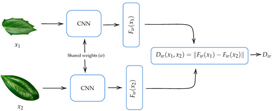 Figure 5 shows a diagram of the convolutional Siamese network used. Here, and are the input images to our convolutional Siamese network, w represents a shared parameter vector, which is tuned during training phase, and and are the features vectors extracted by each of the convolutional neural networks that the Siamese network comprises. The output of the convolutional Siamese network measures the similarity between the feature vectors. Our hypothesis is that, on one hand, two images of leaves of the same species will have a similar feature vectors and therefore their distance is close to zero. On the other hand, two images of leaves of different species will have more different feature vectors and therefore their distance will be larger.