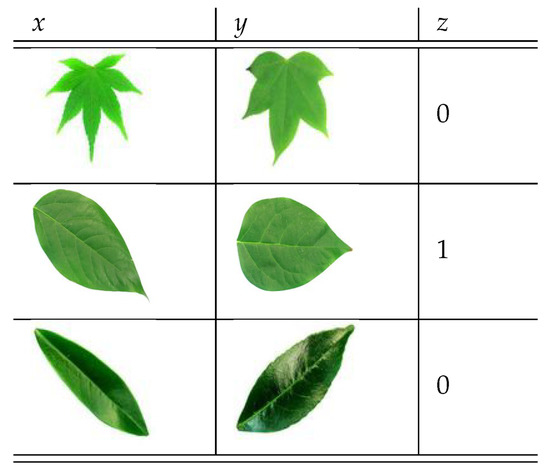 To train the CSN model we use batches of 3-tuples , where x and y are input images, and z is the corresponding label. If the images x and y belong to the same species , otherwise . Figure 6 shows an example of a batch of 3-tuples.