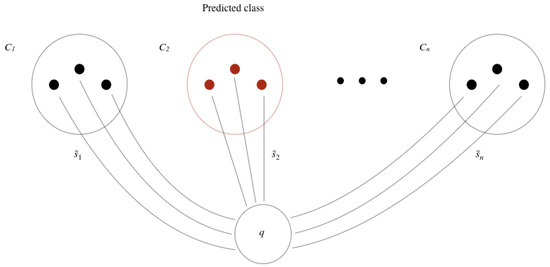That is, the predicted class for image q is the class that on average is more similar to q, according to the similarity function d and reference sets . Figure 8 illustrates the process of classification of a new image q, where the predicted class is and each reference set has three images.