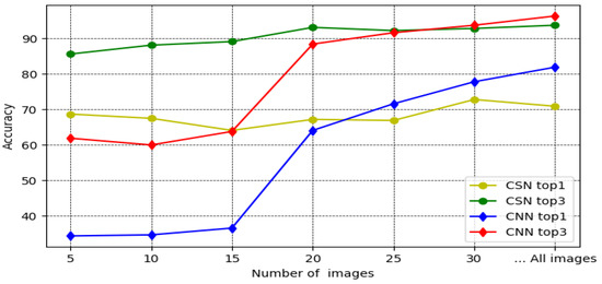 Figure 9 shows graphically the results of Table 2. We can see that for over 25 images per species, the top-1 and top-3 accuracy of the CNN is better. However, for 20 or less images per species, the top-1 and top-3 accuracy of the CSN is consistently better than that of the CNN. Thus, we can say for the threshold value t that .