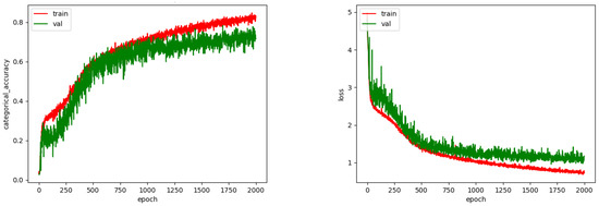 The CNN was trained with 2000 epochs and the best weights were saved for the testing phase. Figure 10 shows the accuracy and loss achieved during training. As we can see, after 1500 epochs an overfitting starts to show, perhaps due to the small amount of images.