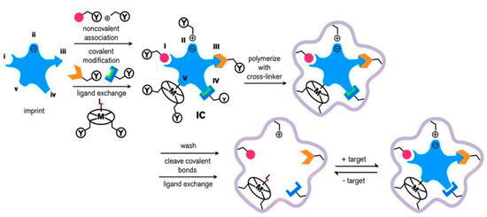 As depicted in Figure 1, the molecular imprinting process can be classified into five groups: (i) non-covalent, (ii) electrostatic, (iii) covalent, (iv) semi-covalent, and (v) metal-mediated. An imprinted polymer is associated with a functional monomer, through non-covalent, covalent, or ligand (L) to metal (M) interactions with complementary functional groups. A pre-complex of the template molecule and functional monomer (IC) is formed, in which the functional monomer is bound to the imprinted molecule via (I) hydrogen bonding or van der Waals interactions, (II) electrostatic or ionic interactions, (III) a covalent bond, (IV) a covalent bond with a spacer, or (V) ligand-metal or metal-ligand coordination. The functional group (Y) mixes with a suitable cross-linker. After the polymerization, the imprinted template molecule (target) is removed through washing, cleavage of chemical bonds, or ligand exchange. The imprinted polymeric matrix may also take part in target recognition and binding through non-specific surface interactions that result from surface properties created around the imprinted template molecule during cross-linking [61].