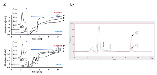 Chromatograms after the extraction of cocaine on plasma and saliva samples (a). The indicators in the plot: imprinted (A) and non-imprinted (B) of plasma spiked with cocaine compared to the blank plasma (C); imprinted (D) and non-imprinted (E) of saliva spiked with cocaine compared to the blank saliva (F). Chromatograms before and after extraction of real black tea samples (b). The indicators in the plot: unspiked black tea sample before (I) and after (II) extraction. Republished with permission from Bouvarel et al. and Rahimi et al. [71,72].