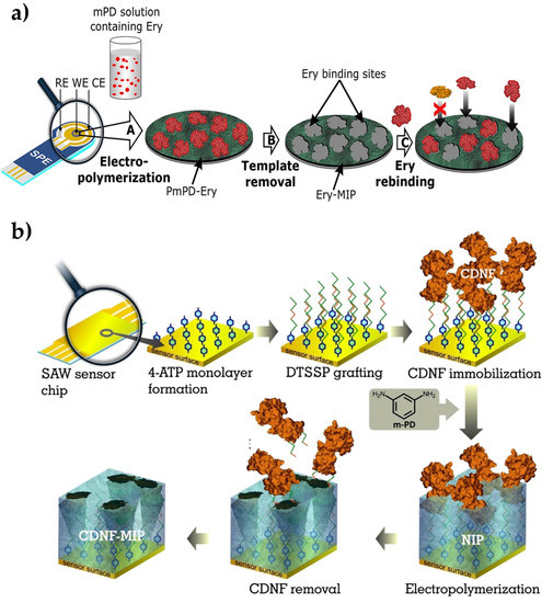 Preparation of the erythromycin-imprinted electrochemical sensor (a) and cerebral dopamine neurotrophic factor protein-imprinted surface acoustic wave sensor (b). Republished with permission from Ayankojo et al. and Kidakova et al. [87,88].