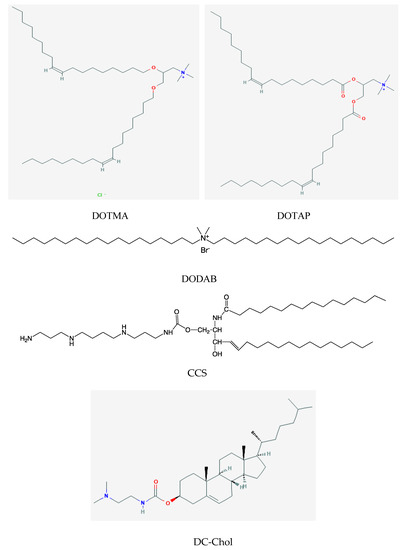 Examples of monocationic lipids are N-(1-(2,3-dioleyloxy)propyl)-N,N,N-trimethylammonium trimethyl chloride (DOTMA), dioleoyl-3-trimethylammonium-propane (chloride salt) (DOTAP), dimethyldioctadecylammonium bromide (DDAB or DODAB), dimethylaminoethane carbamoyl cholesterol (DC-Chol), 1,2-distearoyl-3-trimethylammonium-propane (chloride salt) (DSTAP), and dimyristoyl-3-trimethylammonium-propane (chloride salt) (DMTAP). One example of a polycationic sphingolipid is N-palmitoyl d-erythro-sphingosyl-1-0-carbamoyl-spermine triacetate salt (CCS). Figure 1 shows the chemical structures of DOTMA, DOTAP, DODAB, CCS and DC-Chol.