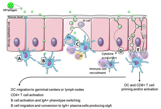 Mucosal immune induction in nasal and airways epithelia by antigen-loaded nanocarriers (NP/antigen). (A) Dendritic cells (DC) protruding arms, the transepithelial dendrites, directly capture the NP/antigen. (B) NP/antigen can also diffuse through epithelial junctions and reach the underlying DC. (C) The M cells create a pocket enriched in immune cells (DC, macrophages-Mφ and lymphocytes T) and perform the sampling of the luminal antigens so that the immune cells contact the NP/antigen. (D) The NP/antigen can also enter cells by endocytosis and deliver the antigens of the nanovaccine into the cells. The endocytosis of NP/antigen by the epithelial cells triggers the production of cytokines, defensines, and chemokines involved in local immune cells recruitment (DC and T cells) able to boost the immune response. (E) The endocytosis of NP/antigen can also be the first step of antigen presentation by epithelial cells. In endosomes, NP could release antigens and be exocytosed as free, unloaded, NP (E1) and/or induce the endosomal escape of the antigens (E2) that will be processed as an endogenous antigen and presented by major histocompatibility complex I (MHC-I) (E3). In the other way, NP could be degraded in endo/lysosomes (E4), and the released antigen will be processed as exogenous and presented by major histocompatibility complex II (MHC-II) (E5). This could lead to DC and CD8+ T cell activation and/or priming. The activated DC from these pathways then migrate to germinal centers or directly to lymph nodes to activate CD4+ T cells that in turn activate B cells. They undergo an IgA+ phenotype switch, migrate by the blood flow to the effector sites and produce secreted IgA (sIgA) as IgA+ plasma cells. Reprinted from [54] with permission from Elsevier, Copyright 2017.