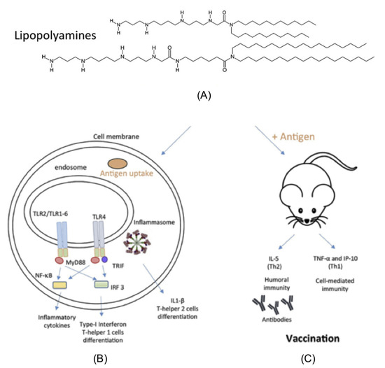 (A) Chemical structure of lipopolyamines (12 or 18 C). (B) Uptake of lipopolyamines alone or complexed with ovalbumin by cultured human cell lines transfected with Toll-like Receptors (TLRs), leading to 1) secretion of inflammatory and type-I interferon cytokines able to trigger a Th1 response (cell-mediated immunity); 2) secretion of the interleukin-1beta (IL-1β) able to induce a Th2 response (humoral immune response). (c) Uptake of lipopolyamines/antigen complexes in vivo by intraperitoneal macrophages induced secretion of interleukin-5 (IL-5) and humoral immunity plus tumor necrosis factor-alpha (TNF-α) and gamma-interferon inducible protein (IP-10) [71], typical inducers of Th1 response (cell-mediated immune response) by the cultured macrophages. Reprinted from [70] with permission from Elsevier, Copyright 2018.