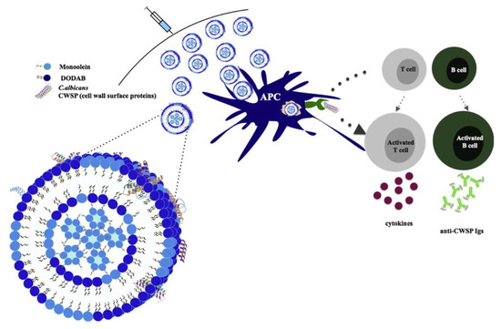 Activation of cell-mediated immunity and humoral response by DODAB/monoolein liposomes incorporating cell wall surface proteins of Candida albicans (CWSP). Reprinted from [77] with permission from Elsevier, Copyright 2015.