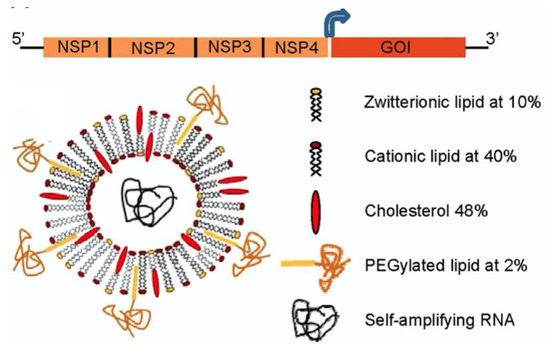 Self-amplifying RNA vaccines where this RNA derived from and alphavirus contains a 5′ cap, nonstructural genes (NSP1-4), 26S subgenomic promoter (dark blue arrow), the gene of interest, and a polyadenylated tail. The self-amplifying RNA was protected inside the cationic liposome with the composition shown in the legend on the right. Reprinted from [99].