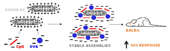 Schematic representation of cross sections for DODAB bilayer fragments (DODAB BF) used for carrying ovalbumin (OVA) and CpG agonist of Toll-like receptor 9. The final assemblies were anionic and directed excellent Th1 response in mice immunized subcutaneously. Curiously, addition of CpG to the assembly did not improve the immune response; DODAB was effective by itself. In addition, the nanosize of the assemblies was more important than the charge. Reprinted from [16] with permission from Elsevier, Copyright 2012.