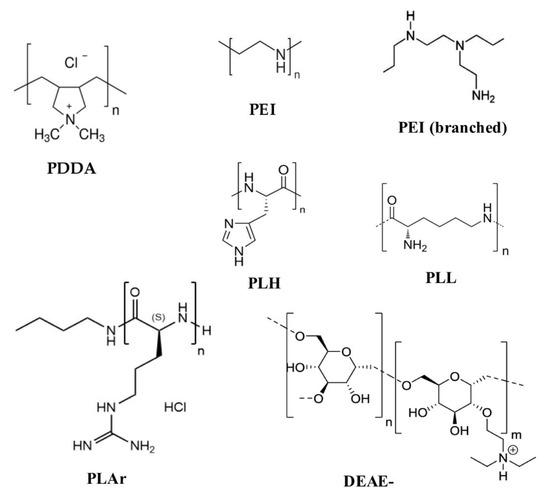 Chemical structures of some cationic polymers: poly (diallyldimethylammonium chloride) (PDDA), linear polyethyleneimine (PEI), branched polyethyleneimine (PEI), poly-l-arginine (PLAr), poly-l-lysine (PLL), poly-l-histidine (PLH), diethylaminoethyl-dextran (DEAE-).